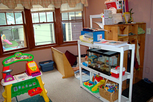 To the left of the door are the cubbies Teacher and his dad built for me years ago. They’re very sturdy and much nicer than what I’ve seen in other centers. Parents sign their children in/out on the form on top of the cubbies, can read the current month’s newsletter and other information I have posted there.