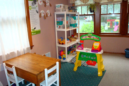 We’ll enter through this door; it opens into the playroom so it’s the most convenient door for parents to use when dropping off and picking up their children.